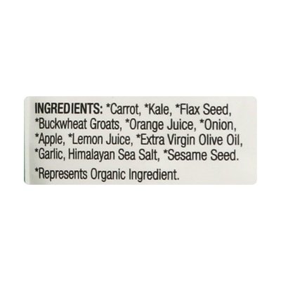 INGREDIENTS: Carrot (Represents Organic Ingredient), Kale (Represents Organic Ingredient), Flax Seed (Represents Organic Ingredient), Buckwheat Groats (Represents Organic Ingredient), Orange Juice (Represents Organic Ingredient), Onion (Represents Organic Ingredient), Apple (Represents Organic Ingredient), Lemon Juice (Represents Organic Ingredient), Extra Virgin Olive Oil (Represents Organic Ingredient), Garlic (Represents Organic Ingredient), Himalayan Sea Salt, Sesame Seeds (Represents Organic Ingredient).