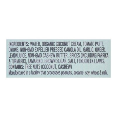 INGREDIENTS: Water, Organic Coconut Cream, Tomato Paste, Onions, Non-GMO Expeller Pressed Canola Oil, Garlic, Ginger, Lemon Juice, Non-GMO Cashew Butter, Spices (Including Paprika & Turmeric), Tamarind, Brown Sugar, Salt, Fenugreek Leaves.