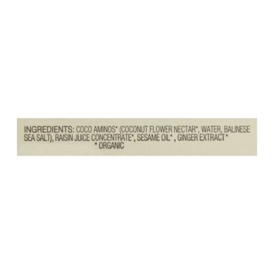 INGREDIENTS: Cocoa Aminos (Organic) (Coconut Flower Nectar (Organic), Water, Balinese Sea Salt), Raisin Juice Concentrate (Organic), Sesame Oil (Organic), Ginger Extract (Organic).