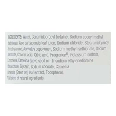 INGREDIENTS: Water, Cocamidopropyl Betaine, Sodium Cocoyl Methyl Isethionate, Aloe Barbadensis Leaf Juice, Sodium Chloride, Stearamidopropyl Dimethylamine, Acrylates Copolymer, Sodium Methyl Isethionate, Sodium Benzoate, Coconut Acid, Citric Acid, Fragrance (a Blend of Natural Ingredients), Potassium Sorbate, Limonene, Camelina Sativa Seed Oil, Trisodium Ethylenediamine Disuccinate, Glycerin, Sodium Cocoate, Camellia Sinensis (Green Tea) Leaf Extract, Tocopherol.