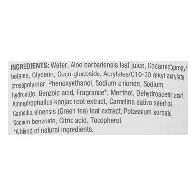 INGREDIENTS: Water, Aloe Barbadensis Leaf Juice, Cocamidopropyl Betaine, Glycerin, Coco-Glucoside, Acrylates/C10-30 Alkyl Acrylate Crosspolymer, Phenoxyethanol, Sodium Chloride, Sodium Hydroxide, Benzoic Acid, Fragrance (a Blend of Natural Ingredients), Menthol, Dehydroacetic Acid, Amorphophallus Konjac Root Extract, Camelina Sativa Seed Oil, Camellia Sinensis (Green Tea) Leaf Extract, Potassium Sorbate, Sodium Benzoate, Citric Acid, Tocopherol.