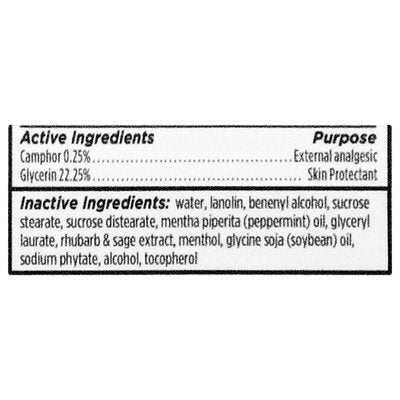 INGREDIENTS: Active Ingredients: Camphor (0.25 %), External Analgesic; Glycerin (22.25 %), Skin Protectant. Inactive Ingredients: Water, Lanolin, Benenyl Alcohol, Sucrose Stearate, Sucrose Distearate, Mentha Piperita (Peppermint) Oil, Glyceryl Laurate, Rhubarb & Sage Extract, Menthol, Glycine Soja (Soybean) Oil, Sodium Phytate, Alcohol, Tocopherol.