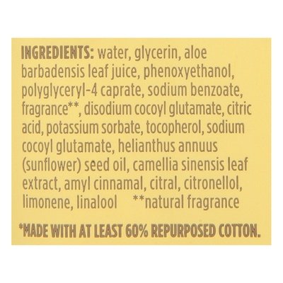 INGREDIENTS: Water, Glycerin, Aloe Barbadensis Leaf Juice, Phenoxyethanol, Polyglyceryl-4 Caprate, Sodium Benzoate, Fragrance (Natural Fragrance), Disodium Cocoyl Glutamate, Citric Acid, Potassium Sorbate, Tocopherol, Sodium Cocoyl Glutamate, Helianthus Annuus (Sunflower) Seed Oil, Camellia Sinensis Leaf Extract, Amyl Cinnamal, Citral, Citronellol, Limonene, Linalool.