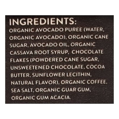 INGREDIENTS: Organic Avocado Puree (Water, Organic Avocado), Avocado Oil, Organic Cane Sugar, Tapioca Starch, Chocolate Flakes (Powdered Cane Sugar, Unsweetened Chocolate, Cocoa Butter, Sunflower Lecithin, Natural Flavor), Organic Coffee, Sea Salt, Organic Guar Gum, Organic Gum Acacia.