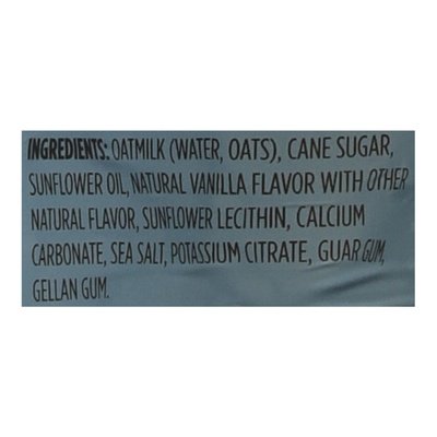 INGREDIENTS: Oatmilk (Water, Oats), Cane Sugar, Sunflower Oil, Natural Vanilla Flavor with Other Natural Flavor, Sunflower Lecithin, Calcium Carbonate, Sea Salt, Potassium Citrate, Guar Gum, Gellan Gum.