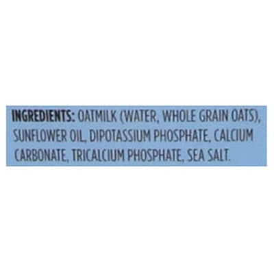 INGREDIENTS: Oatmilk (Water, Oats), Sunflower Oil, Dipotassium Phosphate, Calcium Carbonate, Tricalcium Phosphate, Sea Salt, Vitamin A Palmitate, Vitamin D2.