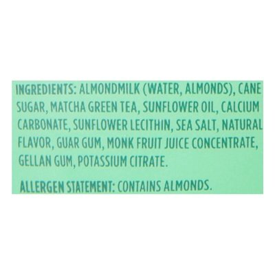 INGREDIENTS: Almondmilk (Water, Almonds), Cane Sugar, Matcha Green Tea, Sunflower Oil, Calcium Carbonate, Sunflower Lecithin, Sea Salt, Natural Flavor, Guar Gum, Monk Fruit Juice Concentrate, Gellan Gum, Potassium Citrate.