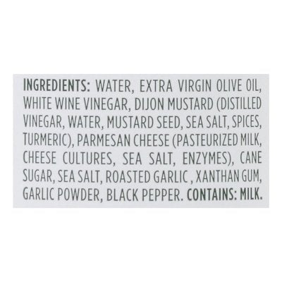 INGREDIENTS: Water, Extra Virgin Olive Oil, White Wine Vinegar, Dijon Mustard (Distilled Vinegar, Water, Mustard Seed, Sea Salt Spies, Turmeric), Parmesan Cheese (Pasteurized Mil, Cheese Cultures, Salt, Enzymes), Cane Sugar, Salt, Black Pepper, Xanthan Gum, Garlic.