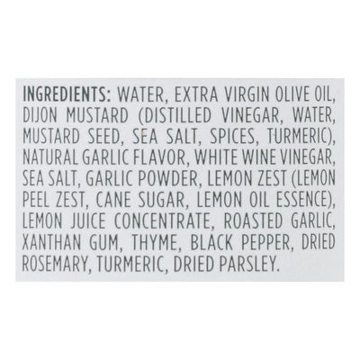 INGREDIENTS: Water, Extra Virgin Olive Oil, Dijon Mustard (Distilled Vinegar, Water, Mustard Seed, Sea Salt, Spices, Turmeric), Natural Garlic Flavor, White Wine Vinegar, Sea Salt, Garlic Powder, Lemon Zest (Lemon Peel Zest, Cane Sugar, Lemon Oil Essence), Lemon Juice Concentrate, Roasted Garlic, Xanthan Gum, Thyme, Black Pepper, Dried Rosemary, Turmeric, Dried Parsley.