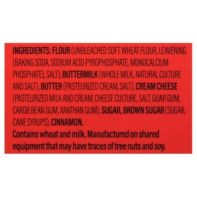 INGREDIENTS: Flour (Unbleached Soft Wheat Flour, Leavening (Baking Soda, Sodium Acid Pyrophosphate, Monocalcium Phosphate), Salt), Buttermilk (Whole Milk, Natural Culture and Salt), Butter (Pasteurized Cream, Salt), Cream Cheese (Pasteurized Milk and Cream, Cheese Culture, Salt, Guar Gum, Caron Bean Gum, Xanthan Gum), Sugar, Brown Sugar (Sugar, Cane Syrups), Cinnamon.