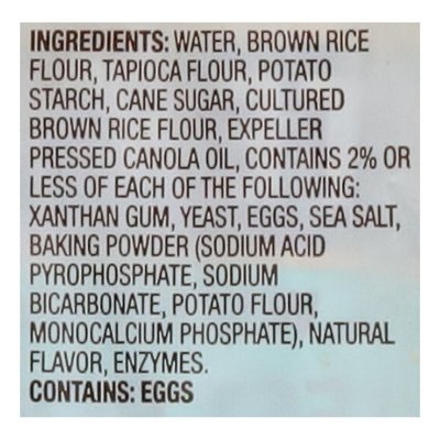 INGREDIENTS: Water, Brown Rice Flour, Tapioca Flour, Potato Starch, Cane Sugar, Cultured Brown Rice Flour, Expeller Pressed Canola Oil, Contains 2% or Less of Each of the Following: Xanthan Gum, Yeast, Eggs, Sea Salt, Baking Powder (Sodium Acid Pyrophosphate, Sodium Bicarbonate, Potato Flour, Monocalcium Phosphate), Natural Flavor, Enzymes.