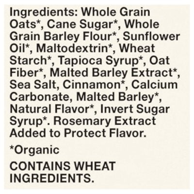 INGREDIENTS: Whole Grain Oats (Organic), Cane Sugar (Organic)Whole Grain Barley Flour (Organic), Sunflower Oil (Organic), Maltodextrin (Organic)Wheat Starch (Organic), Tapioca Syrup (Organic), Oat Fiber (Organic)Malted Barley Extract (Organic), Sea Salt, Cinnamon (Organic)Calcium Carbonate, Malted Barley (Organic), Natural Flavor(Organic), Invert Sugar Syrup (Organic), Rosemary Extract Added to Protect Flavor.