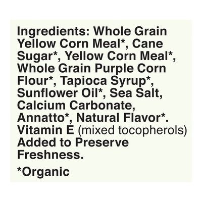 INGREDIENTS: Whole Grain Oats (Organic), Corn Meal (Organic), Cane Sugar (Organic), Tapioca Syrup (Organic), Oat Fiber (Organic), Wheat Starch (Organic), Sea Salt, Sunflower Oil (Organic), Color (Elderberry Juice Concentrate (Organic), Carrot Concentrate (Organic), Pumpkin Concentrate (Organic), Annatto (Organic), Apple Concentrate (Organic)), Natural Flavor (Organic), Dextrose (Organic), Vitamin E (Mixed Tocopherols) Added to Preserve Freshness.