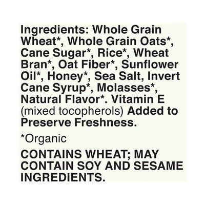 INGREDIENTS: Whole Grain Wheat (Organic), Whole Grain Oats (Organic), Cane Sugar (Organic), Rice (Organic), Wheat Bran (Organic), Oat Fiber (Organic), Sunflower Oil (Organic), Honey (Organic), Sea Salt, Invert Cane Syrup (Organic), Molasses (Organic), Natural Flavor (Organic), Vitamin E (Mixed Tocopherols) Added to Preserve Freshness.