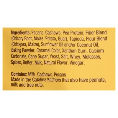 INGREDIENTS: Pecans, Cashews, Pea Protein, Fiber Blend (Chicory Root, Maize, Potato, Guar), Tapioca, Flour Blend (Chickpea, Maize), Sunflower Oil and/or Coconut Oil, Baking Powder, Caramel Color, Xanthan Gum, Calcium Carbonate, Cane Sugar, Yeast, Salt, Whey, Molasses, Spices, Butter, Milk, Natural Flavor, Vinegar.
