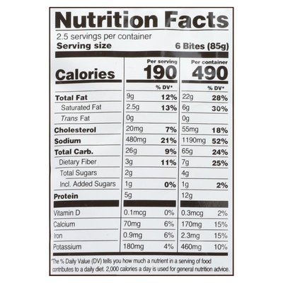 PRODUCT DETAILS: Gluten free always. Certified gluten free. gfco.org (Certified gluten-free by gluten-free certification organization, www.gfco.org). Good source of fiber (No nitrates or nitrites added except those naturally occurring in sea salt and celery juice powder). Contains 0 g of total fat per serving see nutrition information for fat content. Ready in minutes. Love at first bite! Not ready to eat. Drumroll please. Caulipower Pizza Bites are here! After three years of trying to make the perfect alternative to a childhood fave, we finally did it. Baked (never fried) with our signature cauliflower crust and gluten free always. Finally, there's a pizza bite you can feel great about giving your kids. And even sneaking one from their plate;) - Gail Becker, founder, Caulipower. Brought to you by Caulipower a vegolutionary foods brand. Inspected for wholesomeness by U.S. Department of Agriculture. eatcaulipower.com. Follow us on social (at)caulipower Join the Vegolution! Taste our other products. Resealable.