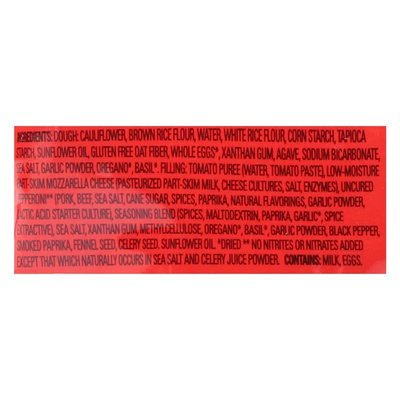 INGREDIENTS: Dough: Cauliflower, Brown Rice Flour, Water, White Rice Flour, Corn Starch, Tapioca Starch, Sunflower Oil, Gluten Free Oat Fiber, Whole Eggs (Dried), Xanthan Gum, Agave, Sodium Bicarbonate, Sea Salt, Garlic Powder, Oregano (Dried), Basil (Dried). Filling: Tomato Puree (Water, Tomato Paste), Low-Moisture Part-Skim Mozzarella Cheese (Pasteurized Part-Skim Milk, Cheese Cultures, Salt, Enzymes), Uncured Pepperoni (No Nitrites or Nitrates Added Except That Which Naturally Occurs in Sea Salt and Celery Juice Powder) (Pork, Beef, Sea Salt, Cane Sugar, Spices, Paprika, Natural Flavorings, Garlic Powder, Lactic Acid Starter Culture), Seasoning Blend (Spices, Maltodextrin, Paprika, Garlic (Dried), Spice Extractive), Sea Salt, Xanthan Gum, Methylcellulose, Oregano (Dried), Basil (Dried), Garlic Powder, Black Pepper, Smoked Paprika, Fennel Seed, Celery Seed, Sunflower Oil.