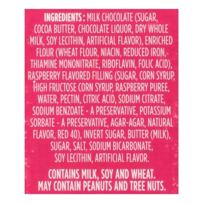 INGREDIENTS: Milk Chocolate (Sugar, Cocoa Butter, Chocolate Liquor, Dry Whole Milk, Soy Lecithin, Artificial Flavor), Enriched Flour (Wheat Flour, Niacin, Reduced Iron, Thiamine Mononitrate, Riboflavin, Folic Acid), Raspberry Flavored Filling (Sugar, Corn Syrup, High Fructose Corn Syrup, Raspberry Puree, Water, Pectin, Citric Acid, Sodium Citrate, Sodium Benzoate - a Preservative, Potassium Sorbate - a Preservative, Agar-Agar, Natural Flavor, Red 40), Invert Sugar, Butter (Milk) Sugar, Salt, Sodium Bicarbonate, Soy Lecithin, Artificial Flavor.