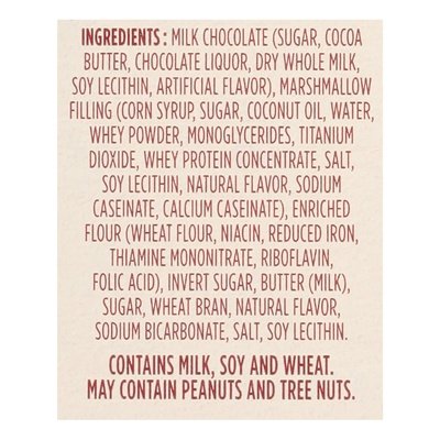 INGREDIENTS: Milk Chocolate (Sugar, Cocoa Butter, Chocolate Liquor, Dry Whole Milk, Soy Lecithin, Artificial Flavor), Marshmallow Filling (Corn Syrup, Sugar, Coconut Oil, Water, Whey Powder, Monoglycerides, Titanium Dioxide, Whey Protein Concentrate, Salt, Soy Lecithin, Natural Flavor, Sodium Caseinate, Calcium Caseinate), Enriched Flour (Wheat Flour, Niacin, Reduced Iron, Thiamine Mononitrate, Riboflavin, Folic Acid), Invert Sugar, Butter (Milk), Sugar, Wheat Bran, Natural Flavor, Sodium Bicarbonate, Salt, Soy Lecithin.