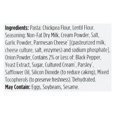 INGREDIENTS:  Pasta: Chickpea Flour, Lentil Flour, Seasoning: Non-Fat Dry Milk, Cream Powder, Salt, Garlic Powder, Parmesan Cheese (Dehydrated) [(Pasteurized Milk, Cheese Culture, Salt, Enzymes) and Sodium Phosphate], Onion Powder, Contains 2% or Less of: Black Pepper, Yeast Extract, Sugar, Cultured Cream (Dehydrated), Parsley (Dehydrated), Safflower Oil, Silicon Dioxide (to Reduce Caking), Mixed Tocopherols (to Preserve Freshness).