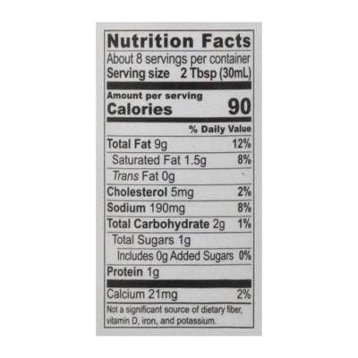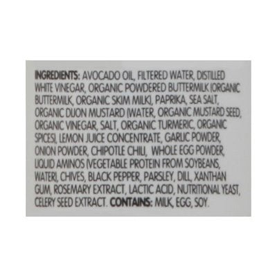 INGREDIENTS: Avocado Oil, Filtered Water, Distilled White Vinegar, Organic Powdered Buttermilk (Organic Buttermilk, Organic Skim Milk), Paprika, Sea Salt, Organic Duon Mustard (Water, Organic Mustard Seed, Organic Vinegar, Salt, Organic Turmeric, Organic Spices), Lemon Juice Concentrate, Garlic Powder, Onion Powder, Chipotle Chili, Whole Egg Powder, Liquid Aminos (Vegetable Protein from Soybeans, Water), Chives, Black Pepper, Parsley, Dill, Xanthan Gum, Rosemary Extract, Lactic Acid, Nutritional Yeast, Celery Seed Extract.