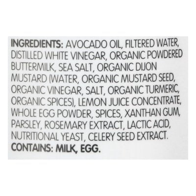 INGREDIENTS: Avocado Oil, Filtered Water, Distilled White Vinegar, Organic Powdered Buttermilk, Sea Salt, Organic Dijon Mustard (Water, Organic Mustard Seed, Organic Vinegar, Salt, Organic Turmeric, Organic Spices), Lemon Juice Concentrate, Whole Egg Powder, Spices, Xanthan Gum, Parsley, Rosemary Extract, Lactic Acid, Nutritional Yeast, Celery Seed Extract.