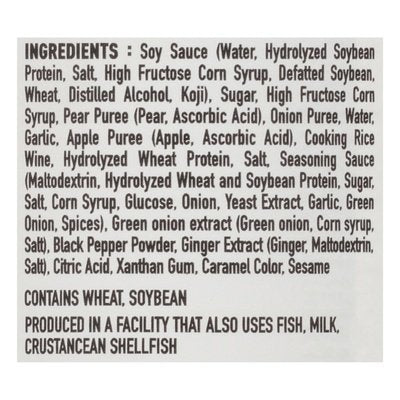 INGREDIENTS: Soy Sauce (Water, Hydrolyzed Soybean Protein, Salt, High Fructose Corn Syrup, Defatted Soybean, Wheat, Distilled Alcohol, Koji), Sugar, High Fructose Corn Syrup, Pear Puree (Pear, Ascorbic Acid), Onion Puree, Water, Garlic, Apple Puree (Apple, Ascorbic Acid), Cooking Rice Wine, Hydrolyzed Wheat Protein, Salt, Seasoning Sauce (Maltodextrin, Hydrolyzed Wheat and Soybean Protein, Sugar, Salt, Corn Syrup, Glucose, Onion, Yeast Extract, Garlic, Green Onion, Spices), Green Onion Extract (Green Onion, Corn Syrup, Salt), Black Pepper Powder, Ginger Extract (Ginger, Maltodextrin, Salt), Citric Acid, Xanthan Gum, Caramel Color, Sesame.