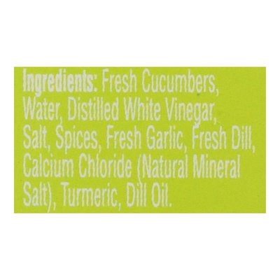 INGREDIENTS: Fresh Cucumbers, Water, Distilled White Vinegar, Salt, Spices, Fresh Garlic, Fresh Dill, Calcium Chloride (Natural Mineral Salt), Turmeric, Dill Oil.