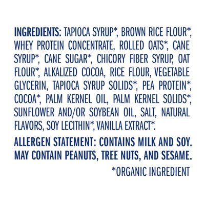 INGREDIENTS: Organic Tapioca Syrup, Organic Brown Rice Flour, Organic Rolled Oats, Organic Cane Syrup, Whey Protein Concentrate, Organic Dried Cane Syrup, Chicory Fiber Syrup, Whey Protein Isolate, Organic Alkalized Cocoa, Organic Oat Flour, Rice Flour, Vegetable Glycerin, Organic Tapioca Syrup Solids, Organic Pea Protein, Organic Cocoa, Palm Kernel Oil (80% Rainforest Alliance Certified), Organic Palm Kernel Solids, Organic High Oleic Sunflower Oil, Natural Flavors, Sea Salt, Organic Soy Lecithin, Organic Vanilla Extract, Salt. Vitamins & Minerals: Calcium Carbonate, Magnesium Oxide, Ferric Orthophosphate (Iron), Zinc Oxide, Ergocalciferol (Vit. D2).