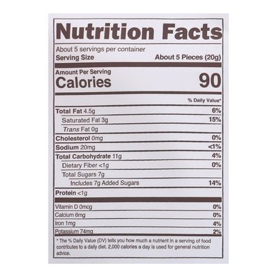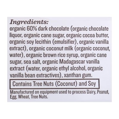 INGREDIENTS: Organic 60% Dark Chocolate (Organic Chocolate Liquor, Organic Cane Sugar, Organic Cocoa Butter, Organic Soy Lecithin (Emulsifier), Organic Vanilla Extract), Organic Coconut Milk (Organic Coconut, Water), Organic Brown Rice Syrup, Organic Cane Sugar, Sea Salt, Organic Madagascar Vanilla Extract (Water, Organic Ethyl Alcohol, Organic Vanilla Bean Extractives), Xanthan Gum.