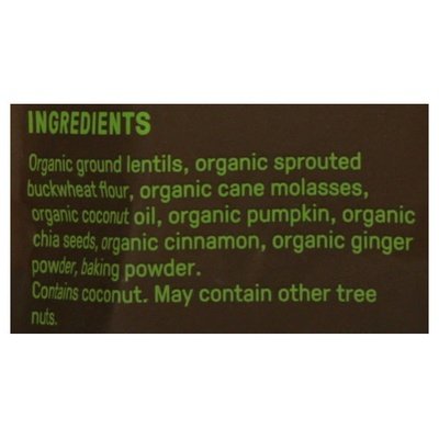INGREDIENTS: Organic Ground Lentils, Organic Sprouted Buckwheat Flour, Organic Cane Molasses, Organic Coconut Oil, Organic Pumpkin, Organic Chia Seeds, Organic Cinnamon, Organic Ginger Powder, Baking Powder.