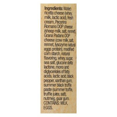 INGREDIENTS: Water, Ricotta Cheese (Whey, Milk, Lactic Acid), Fresh Cream, Pecorino Romano DOP Cheese (Sheep Milk, Salt, Rennet), Grana Padano DOP Cheese (Cow Milk, Salt, Rennet, Lysozyme Natural Eggs Protein), Modified Corn Starch, Natural Flavoring, Whey, Sugar, Sea Salt, Glucone Delta Lactone, Mono and Diglycerides of Fatty Acids, Lactic Acid, Black Pepper, Xanthan Gum, Summer Black Truffle Paste (Summer Truffle, Truffle Juice, Salt), Nutmeg, Guar Gum.