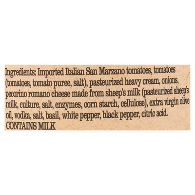 INGREDIENTS: Imported Italian San Marzano Tomatoes, Tomatoes (Tomatoes, Tomato Puree, Salt), Pasteurized Heavy Cream, Onions, Pecorino Romano Cheese Made from Sheep's Milk (Pasteurized Sheep's Milk, Culture, Salt, Enzymes, Corn Starch, Cellulose), Extra Virgin Olive Oil, Vodka, Salt, Basil, White Pepper, Black Pepper, Citric Acid.
