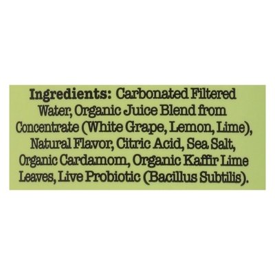 INGREDIENTS: Carbonated Filtered Water, Organic Juice Blend from Concentrate (White Grape, Lemon, Lime), Natural Flavor, Citric Acid, Sea Salt, Organic Cardamom, Organic Kaffir Lime Leaves, Live Probiotic (Bacillus Subtilis).