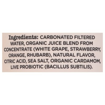 INGREDIENTS: Carbonated Filtered Water, Organic Juice Blend from Concentrate (White Grape, Strawberry, Orange, Rhubarb), Natural Flavor, Citric Acid, Sea Salt, Organic Cardamom, Organic Cardamom, Live Probiotic (Bacillus Subtilis).
