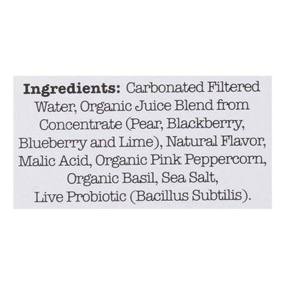 INGREDIENTS: Carbonated Filtered Water, Organic Juice Blend from Concentrate (Pear, Blackberry, Blueberry and Lime), Natural Flavor, Malic Acid, Organic Pink Peppercorn, Organic Basil, Sea Salt, Live Probiotic (Bacillus Subtilis).