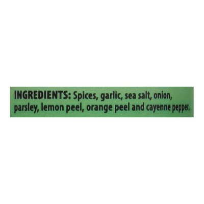 INGREDIENTS: Spices, Garlic, Sea Salt, Onion, Parsley, Lemon Peel, Orange Peel and Cayenne Pepper.
