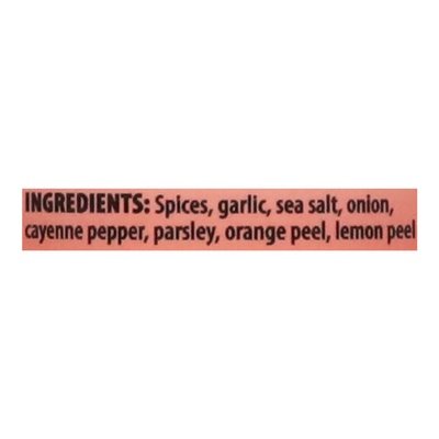 INGREDIENTS: Spices, Garlic, Sea Salt, Onion, Cayenne Pepper, Parsley, Orange Peel, Lemon Peel.
