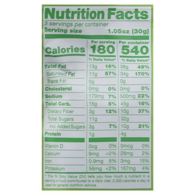 DESCRIPTION: Sweet & toasty crunch. Gluten-free. Nothing but the good stuff: Gluten-free; Dairy-free; Soy-free; Vegan. 50% less sugar than Apple Chips (1 serving of Dang Original Recipe Coconut Chips (30 g) contains 10.5 g of sugar, 1 serving of Apple Chips (30 g) contains 21 g of sugar). No preservatives. Non-GMO. Non-GMO Project verified. nongmoproject.org. Plant-based. Dang that’s good!. What’s a Coconut Chip? Coconut Chips - Ma Praw Ob Krob - started the Dang journey. We harvest mature Thai coconuts, slice up the coconut meat, and toast is to perfection using a recipe that’s true to our roots. Snack straight from the bag, or add a satisfying crunch to your smoothie bowl, salad, or yogurt. Our story. As brothers living between NYC & Bangkok, we grew up eating differently. We created Dang named after our mom - to share uniquely Asian - American snacks with the flavors and ingredients we love. Inside this bag you'll find delicious whole foods and no fake stuff. Dang, that’s good! - Vincent & Andrew. Mama dang approved. dangfoods.com. (at)dangfoods. (hashtag)dangthatsgood. Facebook. Twitter. Instagram. Certified B Corporation. Product of Thailand. < Coconut, Cane Sugar, Salt.