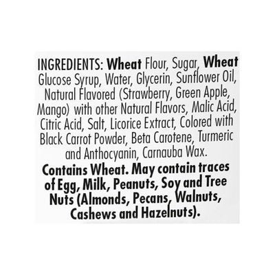 INGREDIENTS: Wheat Flour, Sugar, Glucose Syrup (from Wheat), Glycerin, Water, Palm Oil, Natural flavored (Strawberry, Green Apple, Mango) with other natural flavors, Malic Acid, Citric Acid, Salt, Licorice Extract, Colored with Black Carrots Powder, Beta Carotene, Turmeric, Anthocyanin and Carnauba Wax.