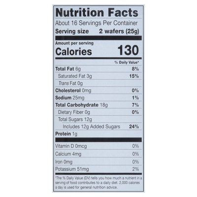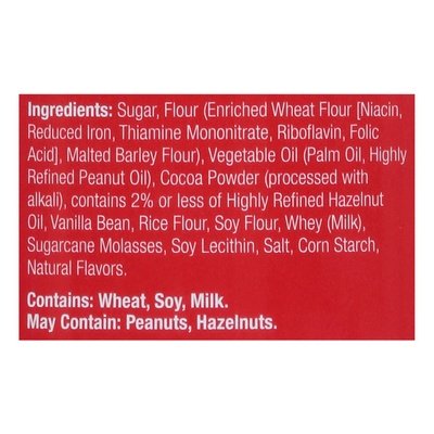 INGREDIENTS: Sugar, Flour (Enriched Wheat Flour [Niacin, Reduced Iron, Thiamine Mononitrate, Riboflavin, Folic Acid], Malted Barley Flour), Vegetable Oil (Palm Oil, Highly Refined Peanut Oil), Cocoa Powder (Processed with Alkali), Contains 2% or Less of Highly Refined Hazelnut Oil, Vanilla Bean, Rice Flour, Soy Flour, Whey (Milk), Sugarcane Molasses, Soy Lecithin, Salt, Corn Starch, Natural Flavors.