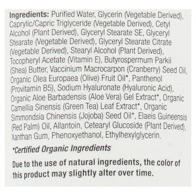 INGREDIENTS: Purified Water, Glycerin (Vegetable Derived), Caprylic/Capric Triglyceride (Vegetable Derived), Cetyl Alcohol (Plant Derived), Glyceryl Stearate SE, Glyceryl Stearate (Vegetable Derived), Glyceryl Stearate Citrate (Vegetable Derived), Stearyl Alcohol (Plant Derived), Tocopheryl Acetate (Vitamin E), Butyrospermum Parkii (Shea) Butter, Vaccinium Macrocarpon (Cranberry) Seed Oil, Organic Olea Europaea (Olive) Fruit Oil (Certified Organic Ingredients), Panthenol (Provitamin B5), Sodium Hyaluronate (Hyaluronic Acid), Organic Aloe Barbadensis (Aloe Vera) Gel Extract (Certified Organic Ingredients), Organic Camellia Sinensis (Green Tea) Leaf Extract (Certified Organic Ingredients), Organic Simmondsia Chinensis (Jojoba) Seed Oil (Certified Organic Ingredients), Elaeis Guineensis (Red Palm) Oil, Allantoin, Cetearyl Glucoside (Plant Derived), Xanthan Gum, Phenoxyethanol, Ethylhexylglycerin.