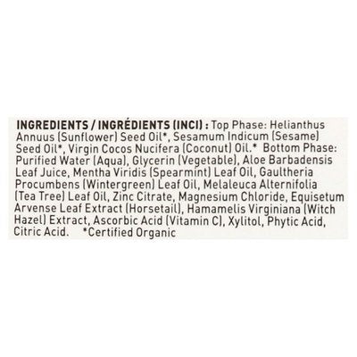 INGREDIENTS: Top Phase: Helianthus Annuus (Sunflower) Seed Oil (Certified Organic), Sesamum Indicum (Sesame) Seed Oil (Certified Organic), Virgin Cocos Nucifera (Coconut) Oil (Certified Organic), Bottom Phase: Purified Water (Aqua), Glycerin (Vegetable), Aloe Barbadensis Leaf Juice. Mentha Viridis (Spearmint) Leaf Oil, Gaultheria Procumbens (Wintergreen) Leaf Oil, Melaleuca Alternifolia (Tea Tree) Leaf Oil, Zinc Citrate, Magnesium Chloride, Equisetum Arvense Leaf Extract (Horsetail), Hamamelis Virginiana (Witch Hazel) Extract, Ascorbic Acid (Vitamin C), Xylitol, Phytic Acid, Citric Acid.