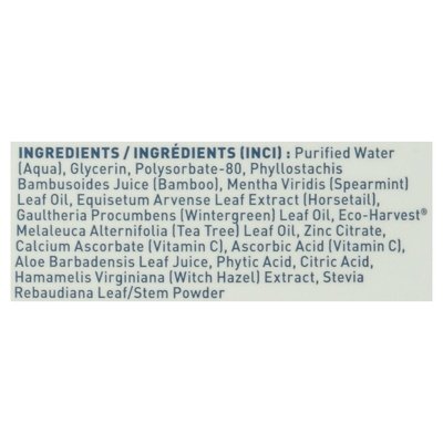 DESCRIPTION: Sugar free. Vegan. Gluten free. Non GMO Project verified. nongmoproject.org. Alcohol free. Keep your smile bright and your mouth healthy with Desert Essence tea tree oil whitening plus mouthwash. A botanical blend of oil and extracts including bamboo juice, horsetail extract and soothing aloe provide care for teeth and gums. Australian tea tree oil helps defend against sugar acids while zinc citrate helps reduce buildup. A cool minty blend of spearmint and wintergreen oils help keep your mouth feeling clean and extra fresh. www.desertessence.com. Certified B Corporation. No animal testing. Cruelty-free. Made in the U.S.A with globally sourced ingredients. < Purified Water (Aqua), Glycerin, Polysorbate-80, Phyllostachis Bambusoides Juice (Bamboo), Mentha Viridis (Spearmint) Leaf Oil, Equisetum Arvense Leaf Extract (Horsetail), Gaultheria Procumbens (Wintergreen) Leaf Oil, Eco-Harvest Melaleuca Alternifolia (Tea Tree) Leaf Oil, Zinc Citrate, Calcium Ascorbate (Vitamin C), Ascorbic Acid (Vitamin C), Aloe Barbadensis Leaf Juice, Phytic Acid, Citric Acid, Hamamelis Virginiana (Witch Hazel) Extract, Stevia Rebaudiana Leaf/Stem Powder.