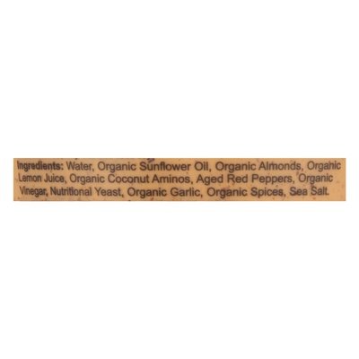 INGREDIENTS: Water, Organic Sunflower Oil, Organic Almonds, Organic Lemon Juice, Organic Coconut Aminos, Aged Red Peppers, Organic Vinegar, Nutritional Yeast, Organic Garlic, Organic Spices, Sea Salt.