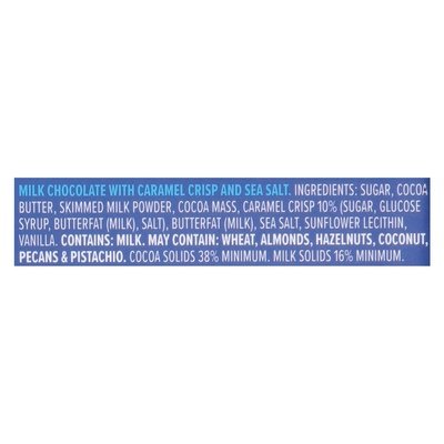 INGREDIENTS: Sugar, Cocoa Butter, Skimmed Milk Powder, Cocoa Mass, Caramel Crisp 10% (Sugar, Glucose Syrup, Butterfat (Milk), Salt), Butterfat (Milk), Sea Salt, Sunflower Lecithin, Vanilla.