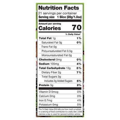 PRODUCT DETAILS: 70 calories. 3 g protein. 2 g fiber. 140 mg ALA omega-3. 12 g whole grains. USDA Organic. Whole Grain: 12 g or more per serving. eat 48 g or more of whole grains daily. WholeGrainCouncil.org. Certified Organic: Quality Assurance International. Non-GMO Project verified. nongmoproject.org. Made For Greatness: No high fructose corn syrup. No artificial preservatives. No artificial ingredients. Always power-packed with whole grains. Always USDA organic. Always Non-GMO. Always made with killer taste and texture. 15 years in prison. That's a tough way to find yourself. Dave dahl realized he was in the wrong game and knew he had more to offer. His brother, Glenn, saw a change in him and gave Dave a second chance by welcoming him back to the family bakery. Dave set out to make a loaf like no other - the most nutritious, organic whole grain bread - and the result is what he called killer bread. Dave's killer bread is built on the belief that everyone is capable of greatness. What began as one man's journey has turned into so much more. Today, one third of the employees at our Oregon bakery have a criminal background, and we have witnessed first-hand how stable employment sparks personal transformation. Loaded with grainy texture and hearty flavor, 21 Whole Grains and Seeds Thin-Sliced has 70 calories, 12g of whole grains, and 3g of protein per slice. That's what we call big nutrition in a little slice! Daveskillerbread.com. Spread the love! Facebook. Twitter. Instagram. YouTube. Learn more at: daveskillerbread.com. Questions or comments? daveskillerbread.com/contact. Stand Behind Second Chances: Everyone is capable of greatness. Dave's Killer Bread has witnessed first-hand how stable employment sparks transformation in people with criminal backgrounds. Pledge your support and motivate more companies to harness the power of Second Chance Employment. Please recycle or reuse this bag.