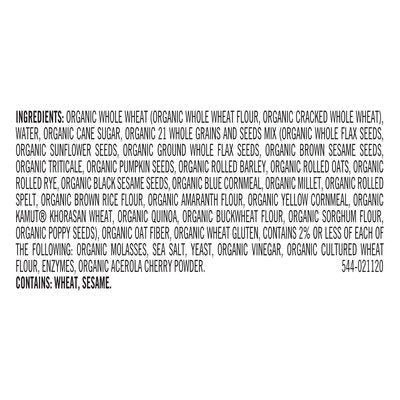 INGREDIENTS: Organic Whole Wheat (Organic Whole Wheat Flour, Organic Cracked Whole Wheat), Water, Organic Cane Sugar, Organic 21 Whole Grains and Seeds Mix (Organic Whole Flax Seeds, Organic Sunflower Seeds, Organic Ground Whole Flax Seeds, Organic Brown Sesame Seeds, Organic Triticale, Organic Pumpkin Seeds, Organic Rolled Barley, Organic Rolled Oats, Organic Rolled Rye, Organic Black Sesame Seeds, Organic Blue Cornmeal, Organic Millet, Organic Rolled Spelt, Organic Brown Rice Flour, Organic Amaranth Flour, Organic Yellow Cornmeal, Organic KamutⓇ Khorasan Wheat, Organic Quinoa, Organic Buckwheat Flour, Organic Sorghum Flour, Organic Poppy Seeds), Organic Oat Fiber, Organic Wheat Gluten, Contains 2% or Less of Each of the Following: Organic Molasses, Sea Salt, Yeast, Organic Vinegar, Organic Cultured Wheat Flour, Enzymes, Organic Acerola Cherry Powder.
