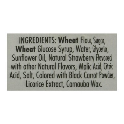 DESCRIPTION: Strawberry flavored with other natural flavors. No palm oil. No high fructose corn syrup. Non GMO Project verified. nongmoproject.org. Plant based. Australia's Original Soft Eating Licorice: What really happened on that dark & stormy night back in 1957 when Darrell Lea invented the world's first soft eating licorice recipe? Was it a moment of genius or a happy accident? One thing is certain; once you experience Darrell Lea's unique, soft eating texture, you'll understand why it's the number 1 selling licorice in Australia. Should it not meet your expectations, please return it to your place of purchase. Vegetarian Society Approved. www.darrelllea.com. nongmoproject.org. Facebook. Instagram. Facebook.com/dleausa. Instragram: (at)darrellleaUS. Get all the good news at: www.darrelllea.com. Made in Australia. < Wheat Flour, Sugar, Wheat Glucose Syrup, Water, Glycerin, Sunflower Oil, Natural Strawberry Flavored with Other Natural Flavors, Malic Acid, Citric Acid, Salt, Colored with Black Carrot Powder, Licorice Extract, Carnauba Wax.
