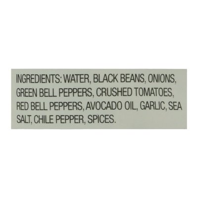 INGREDIENTS: Water, Black Beans, Onions, Green Bell Peppers, Crushed Tomatoes, Red Bell Peppers, Avocado Oil, Garlic, Sea Salt, Chile Pepper, Spices.